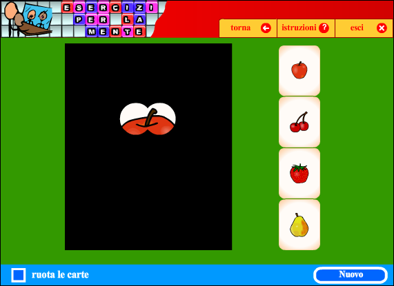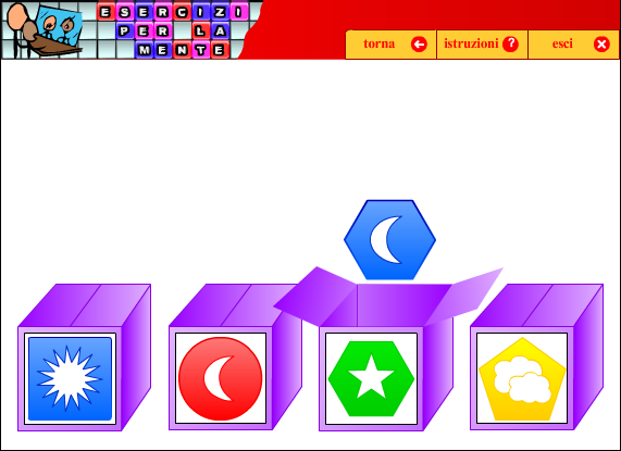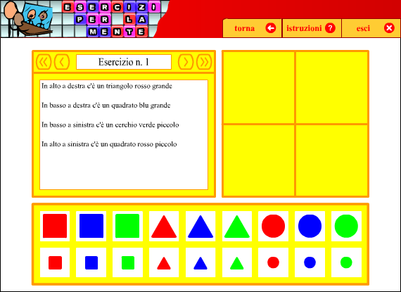 Si tratta di un esercizio che richiede capacità di comprendere le frasi, integrare fra loro le diverse informazioni, inferire le informazioni mancanti attraverso un ragionamento logico. Il compito consiste nel trascinare le forme giuste sulle quattro caselle grandi. La difficoltà del compito aumenta con il procedere degli esercizi.