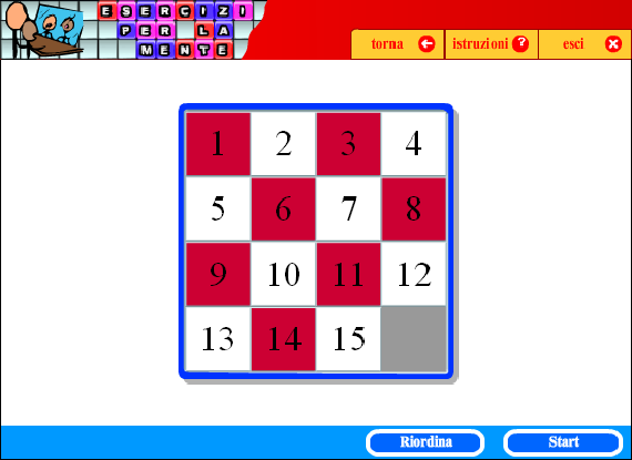 Il classico gioco dei 15 richiede abilità visuo-spaziali e capacità di pianificazione. Il compito consiste nel riportare le tessere nella posizione iniziale, facendo scivolare quelle che si trovano vicino all'unico spazio libero della scacchiera.