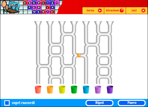 Il compito consiste nel far cadere una pallina colorata nel tubo che conduce al bicchiere dello stesso colore. Nella sua discesa la pallina cambia direzione ad ogni raccordo incontrato.