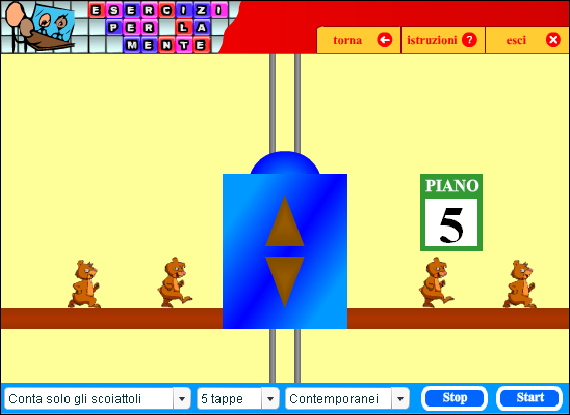 All'avvio dell'esercizio alcuni scoiattoli entrano nell'ascensore, poi l'ascensore sale di qualche piano, quindi si ferma, qualche scoiattolo scende, altri salgono, e così via. Si tratta di memorizzare il numero di scoiattoli rimasti dentro e il numero del piano a cui l'ascensore si trova.