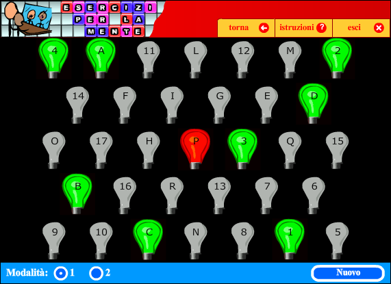 Il compito, ispirato al Trail Making Test, consiste nell'accendere tutte le lampadine alternando correttamente numeri e lettere, secondo l'ordine 1-A-2-B-3-C-......-R-17.