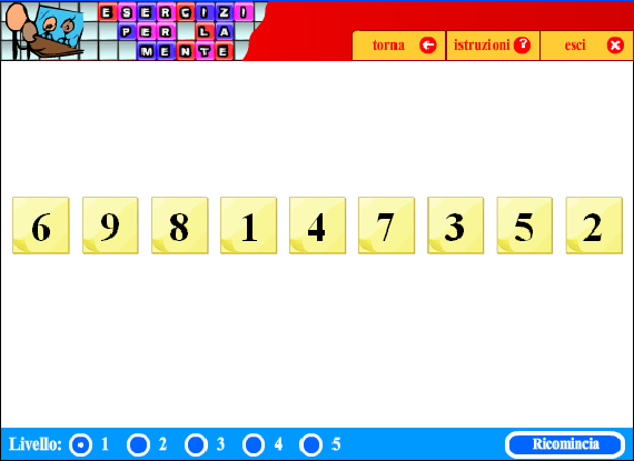 Il compito consiste nel mettere in ordine i numeri da 1 a 9. Cliccando sulle caselle (oppure tasti da 1 a 9) si provoca lo spostamento delle cifre, secondo regole diverse per ogni livello di difficoltà.