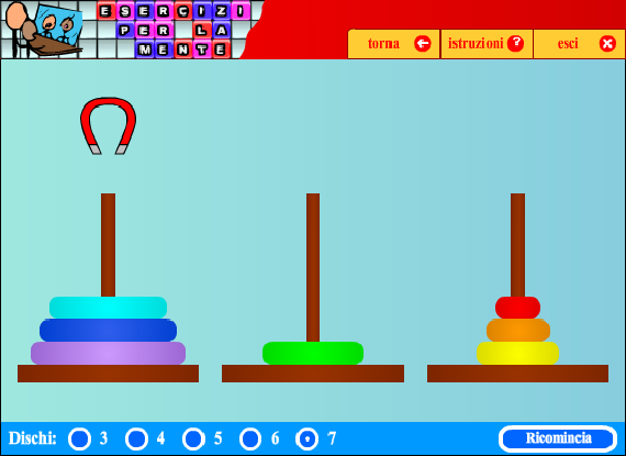 Si tratta di un compito che richiede capacità di pianificazione e di problem solving. Una torre deve essere spostata da una base ad un'altra, un pezzo per volta, senza poter disporre pezzi grandi sopra pezzi più piccoli.